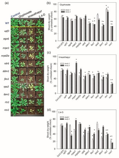 (a) Effect of sublethal doses of glyphosate, imazethapyr and 2,4-D on Arabidopsis thaliana wild type (WT) and selected chromatin mutants 10 days after treatment (DAT). (b–d) Shoot dry weight from treated plants compared to non-treated plants (% untreated check) after (b) glyphosate, (c) imazethapyr and (d) 2,4-D treatment. The mean of each study (1 and 2) was composed by three biological replicates, studies 1 and 2 followed by different letter differ significantly by Tukey’s test (p ≤ 0.05); ns = nonsignificant. Treated mutants followed by asterisk differ significantly from treated WT, according to Tukey’s test (p ≤ 0.05); * compared to WT.