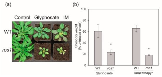 (a) Visual effect (b) shoot dry weight of A. thaliana Col-0 wild type (WT) and ros1 mutant corresponding to study 3, 10 days after treatment (DAT) of glyphosate and imazethapyr (IM). Error bars indicate the standard deviation of four biological replicates, statistically significant differences relative to WT is indicated by asterisk (t-test, p ≤ 0.05); * compared to WT.