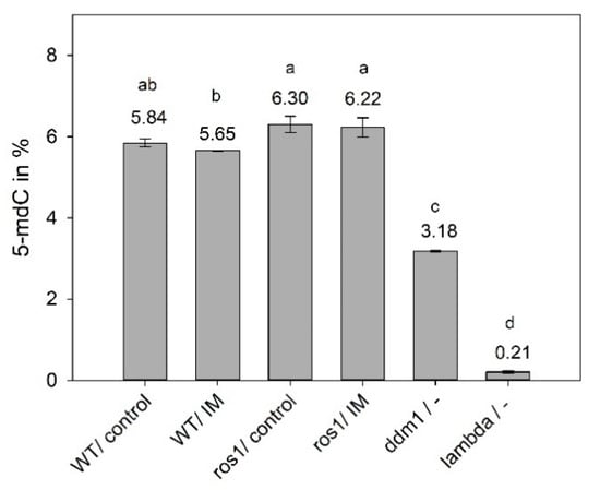 HPLC measurement of global 5-mdC (%) in wild type (WT) and ros1, in the control condition and after treatment with imazethapyr (IM), 48 h after treatment. ddm1 and lambda phage DNA were used as low and high DNA methylation controls, respectively. Error bars denote standard deviations from three biological replicates. Means followed by a different letter differ significantly according to Tukey’s test (p ≤ 0.05).
