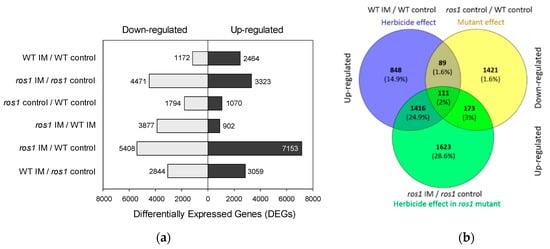 (a) Differentially expressed genes (DEGs) in response to imazethapyr (IM) and in the control condition in wild type (WT) and ros1 mutant. The number of up and downregulated genes is represented in black and gray bars, respectively. The differences in gene expression were obtained based on the Log2 Fold Change ≥2 and adjusted p-value < 0.05 in Cuffdiff. (b) Venn diagrams showing the overlap of genes comparing genes inducted by IM in WT (herbicide effect—blue circle), with repressed genes in ros1 (mutant effect—yellow circle) and effect of IM in ros1 (herbicide effect on mutant—green circle).