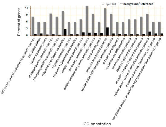 Detailed information of biological process representing the percent of genes involved in biological process pathways of 89 genes of interest induced by imazethapyr (IM) in wild type (WT) and downregulated in ros1 mutant, performed by using singular enrichment analysis (SEA) in AgriGo. Gray and black bars indicate the percent of genes related to the input list and the percent of genes compared to genome reference, respectively.