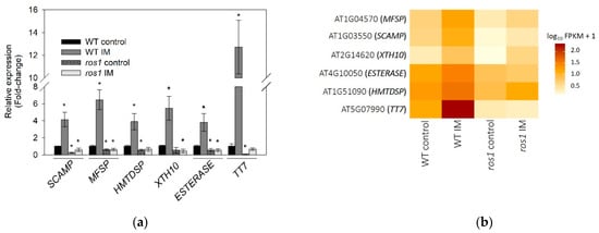 Transcriptionally regulated genes in response to herbicide application in wild type (WT) A. thaliana are not upregulated in the ros1 mutant. (a) Quantitative PCR validation (fold-change) of genes from the differentially expressed genes (DEGs) profiling. Error bars indicate the standard deviation of three biological replicates and asterisks indicate significant differences between the treatments and A. thaliana wild type (WT) control according to t-test (p < 0.05); * compared to WT control. (b) Differentially expressed genes (DEGs) were performed by using CummeRbund, comparing genes in response to imazethapyr (IM) in A. thaliana wild type (WT) and ros1, the gene-normalized signal intensities are shown in the heat map.