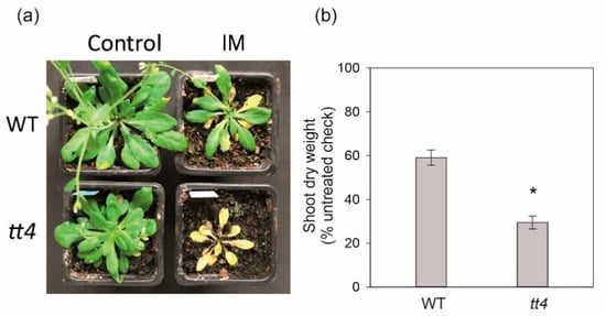 TT4 function for the rate-limiting step into flavonol production is necessary for A. thaliana tolerance to low herbicide dose. (a) Visual effect, (b) shoot dry weight of A. thaliana wild type (WT) and tt4 mutant 14 days after application of imazethapyr (IM). Error bars indicate the standard deviation of four biological replicates, statistically significant differences relative to WT is indicated by asterisk (t-test, p ≤ 0.05); * compared to WT.
