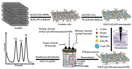 - Puangjan, A.; Chaiyasith, S. An efficient ZrO2/Co3O4/reduced graphene oxide nanocomposite electrochemical sensor for simultaneous determination of gallic acid, caffeic acid and protocatechuic acid natural antioxidants. Electrochim. Acta 2016, 211, 273–288. [Google Scholar] [CrossRef]