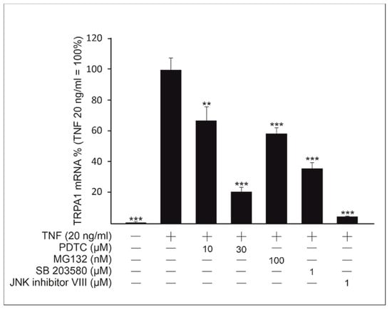 Transient receptor potential ankyrin 1 (TRPA1) upregulation by tumor necrosis factor (TNF) is mediated by nuclear factor kappa B (NF-κB), and p38 and c-Jun N-terminal kinase (JNK) mitogen-activated protein kinase (MAPK) pathways. TRPA1 expression was induced by TNF (20 ng/mL), and pharmacological inhibitors of the signaling routes were applied. p38 MAPK inhibitor SB 203580 (1 µM), JNK inhibitor VIII (1 µM) and NF-κB inhibitors MG132 (100 nM) and pyrrolidinedithiocarbamate ammonium (PDTC; 10 and 30 µM) were used. Incubations were continued for 24 h, after which total RNA was isolated and TRPA1 expression was measured using RT-PCR. Results were normalized against GAPDH mRNA. TNF-induced TRPA1 expression in the absence of the signaling inhibitors was set as 100% and the other values are given in relation to that value. Results are expressed as mean + SEM, n = 4. Statistical significance was calculated against cells stimulated with TNF only using one-way ANOVA with Bonferroni’s post-test. ** = p < 0.01, *** = p < 0.001.