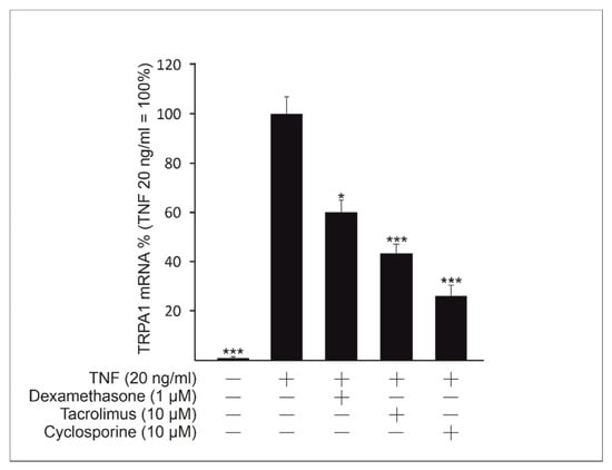 As TRPA1 was shown to be induced by the key inflammatory cytokine TNF, and its expression was mediated via inflammatory signaling pathways, we aimed to investigate whether immunosuppressive drugs affect TRPA1 expression. Effects of the calcineurin/nuclear factor of activated T-cells (NFAT) pathway inhibitors cyclosporine and tacrolimus, and the potent glucocorticoid dexamethasone, drugs widely used in the treatment of inflammatory skin conditions, were studied. Interestingly, we found that both cyclosporine and tacrolimus significantly inhibited TNF-induced TRPA1 upregulation (Figure 3). Dexamethasone was also found to inhibit TRPA1 expression (Figure 3).