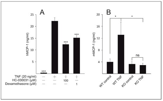 TRPA1 activation leads to cellular influx of cations, especially Ca2+ and Na+. Calcium widely regulates gene expression [] and, accordingly, TRPA1 activation has been reported to regulate the expression of certain inflammatory factors [,,,,]. Here we showed that TNF-stimulated human keratinocytes produce decreased amounts of MCP-1 under TRPA1 antagonist (HC-030031) therapy, indicating that TRPA1 supports the production of MCP-1 upon TNF stimulation in these cells. Accordingly, we found that in skin samples from mice, TNF-induced MCP-1 production was significantly lower in TRPA1 KO mice compared to WT mice. MCP-1, also known as chemokine (C-C motif) ligand 2 (CCL2), is a potent chemokine linked to many inflammatory conditions mainly attracting monocytes/macrophages to the inflammatory tissue []. Intriguingly, MCP-1 is seen as a major factor also in psoriasis, where keratinocytes are an important source of MCP-1, contributing to lesion formation []. Our results are supported by previous results showing that HC-030031 attenuated MCP-1 production in response to urate crystals []. Thus, we suggest that TRPA1 supports the production of MCP-1 in keratinocytes in inflammatory conditions, potentially linking TRPA1 to the pathogenesis of psoriasis and other inflammatory conditions of the skin.