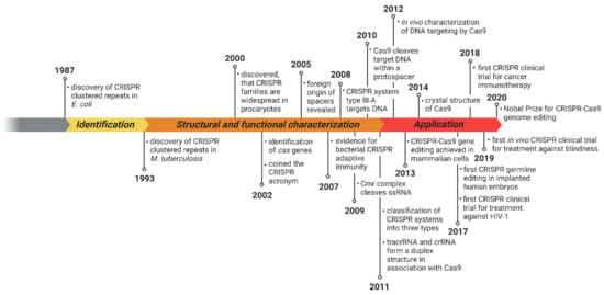 Figure 1. Timeline of the Clustered Regularly Interspaced Palindromic Repeats (CRISPR)–Cas system with important milestones; figure created with BioRender.com (accessed on 15 February 2021).