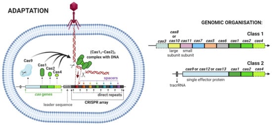 Figure 2. Left side: CRISPR adaptation step [2,9,10,14]. Right side: Generalized genomic organization in class 1 and class 2 systems. A dashed outline indicates that the gene is dispensable or missing in some subtypes or variants [14]. The figure was created with BioRender.com (accessed on 20 March 2021).