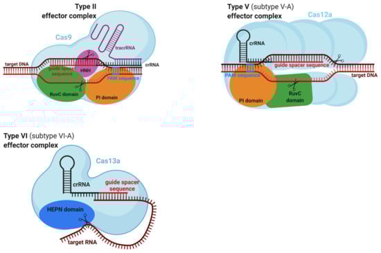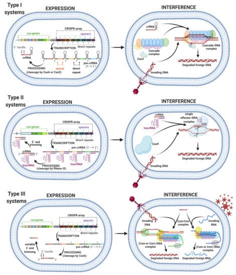 Figure 3. CRISPR expression and interference step in type I (top), type II (middle), and type III (bottom) systems. The figure was created with BioRender.com (accessed on 15 February 2021).