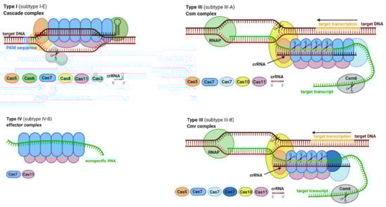 Figure 4. Selected multiprotein effector complexes of CRISPR class 1 systems. Figure was created with BioRender.com (accessed on 15 February 2021).