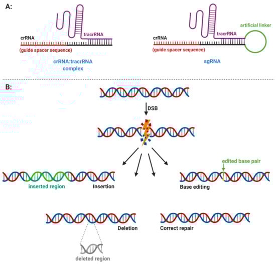 Figure 6. (A) General structure of the CRISPR RNA (crRNA)–trans-activating CRISPR RNA (tracrRNA) complex and artificial single-guide RNA (sgRNA). (B) CRISPR–Cas-assisted gene editing. The figure was created with BioRender.com (accessed on 15 February 2021).