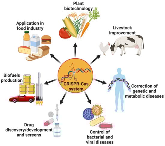 Thereafter, CRISPR research continued to bloom year after year in thousands of laboratories across the world; the success stories of this novel technology are schematically depicted in few articles. Identification of the CRISPR array and its associates in archaeal and bacterial genomes as efficient defense mechanisms for survival and protection against viral invasion was repurposed as a gene-editing technology to modify eukaryotic genomes that created enormous applications in various field of biology extending from medicine to agriculture. Transfer and reprogramming of the CRISPR–Cas system were conducted immensely in this period. A study showed CRISPR–Cas9 system transfer from Streptococcus thermophilus to Escherichia coli providing immunity against plasmid and phage infestation [11]. David Bikard and coworkers engineered Cas9 as a transcriptional repressor preventing binding of RNA polymerase (RNAP) to promoter sequences or hindering RNAP [12]. This was proven an asset in the field of gene regulation and synthetic biology and biotechnological applications. With more research, the toolbox of the CRISPR–Cas system improved, and simultaneously, its application flourished. This review focuses on comprehensive detailing of the CRISPR–Cas system’s application in various fields of agriculture, animal husbandry, health, and diseases, etc. The history of the CRISPR–Cas system is summarized in Figure 1.