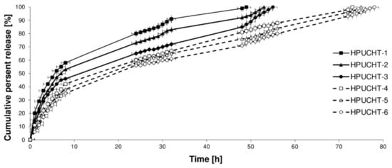In our study, it was observed that the kinetic release of GEN is mainly influenced by the content of the PEG units in the copolymers used for the preparation of hydrogels. For example, approximately 80.8%, 73.4% and 65.2% of GEN were released after 24 h from the HPUCHT-1, HPUCHT-2 and HPUCHT-3 samples, respectively. This is relatively little, because 60.7%, 58.3% and 56.8% of GEN were released after 24 h from the HPUCHT-4, HPUCHT-5 and HPUCHT-6 materials composed of PCL segments in different molar ratios (Table 2). Thereby, we can conclude that GEN was released more rapidly from materials created of PLA polymers than from PCL segments. After 49, 53 and 55 h, almost 100% of GEN was released from hydrogels composed of PLA units (Figure 1). In the case of PCL polymer materials, the time for the GEN releasing in 100% was longer and ranged up to 78 h (Figure 1). This is undoubtedly related to the higher hydrophilicity of hydrogels obtained from PLA-PEG copolymers compared with those obtained from PCL-PEG copolymers. The Mn of the PLA-PEG or PCL-PEG copolymers used in the hydrogel synthesis did not appear to affect the amount of GEN released. This could be because the Mn values of all copolymers were similar (3200–3700 g/mol) (which was consistent with the authors’ assumptions). It was also discovered that the higher the PEG content in a given matrix composed of PLA or PCL units, the higher the amount of GEN released.