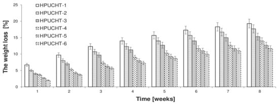 The swelling capacity of the obtained hydrogels was determined (Table 2). The value of the coefficient of the mass swelling ratio (MSR) was 375%, 311%, 284%, 297%, 258% and 211% after 4 h for HPUCHT-1, HPUCHT-2, HPUCHT-3, HPUCHT-4, HPUCHT-5 and HPUCHT-6, respectively. As we can easily see, the value of the MSR depended on the nature of the polyester used and the content of the PEG units in the hydrogel chain. As expected, MSR increases with the growth of hydrophilic fragments—PEG units in the polymer chain.