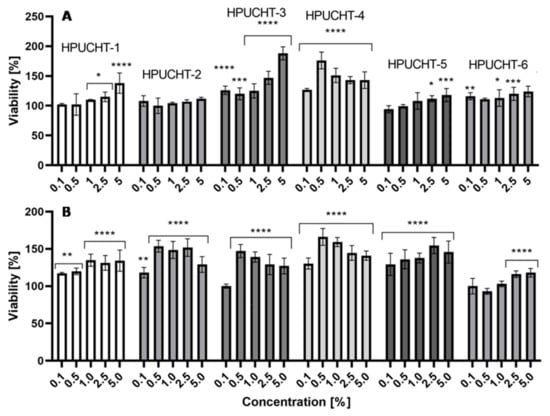 Effectof different concentrations of extracts (0.1–5%) from hydrogels on NR uptake in cultured HaCaT cells after 2 h (A) and 24 h (B) of exposure. **** p ≤ 0.0001, *** p ≤ 0.001, ** p ≤ 0.01, * p ≤ 0.05 versus the control (100%).