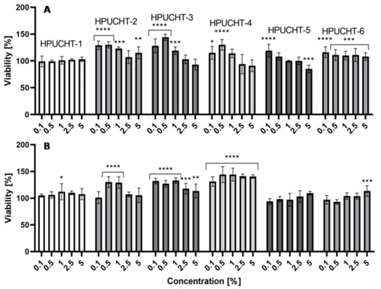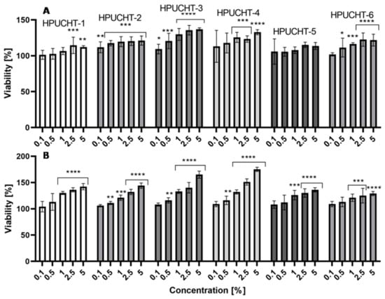 Thereduction of resazurin after 2 h (A) and 24 h (B) of exposure to extracts (0.1–5%) from hydrogels in cultured HaCaT cells. **** p ≤ 0.0001, *** p ≤ 0.001, ** p ≤ 0.01, * p ≤ 0.05 versus the control (100%).