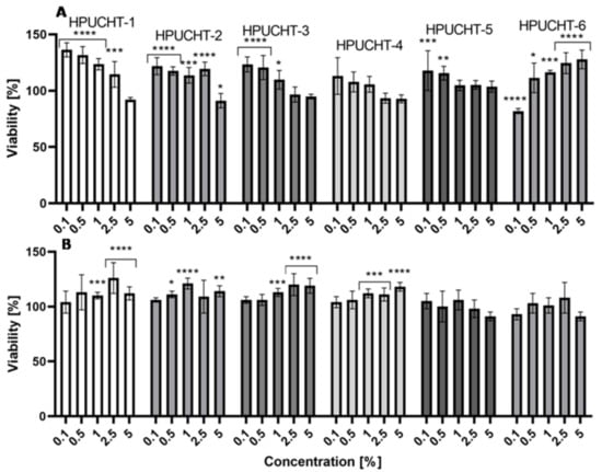 In the case of the Alamar Blue assay, no cytotoxicity of the analyzed hydrogels was observed for eithertypes of skin cells. These analyses showed that the longer exposure time (up to 24 h) to the tested hydrogels significantly increased the metabolic activity of the fibroblasts, which reached 165 and 175% for HPUCHT-3 and HPUCHT-4 hydrogels at the highest concentrations (Figure 5A,B). On the other hand, better results were obtained for a shorter incubation time for keratinocytes, indicating a higher sensitivity of these cells to the action of the hydrogels tested.