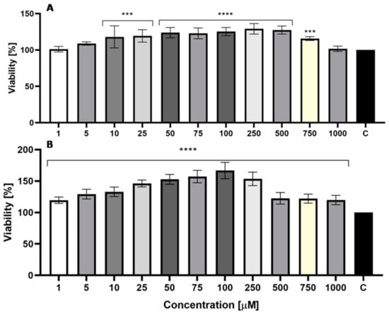 The reduction of resazurin after 2 h (A) and 24 h (B) of exposure to GEN (1–1000 µM) in cultured fibroblasts. **** p ≤ 0.0001, *** p ≤ 0.001 versus the control (100%).