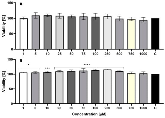 The reduction of resazurin after 2 h (A) and 24 h (B) of exposure to GEN (1–1000 µM) in cultured HaCaT cells. **** p ≤ 0.0001, *** p ≤0.001,* p ≤ 0.05 versus the control (100%).
