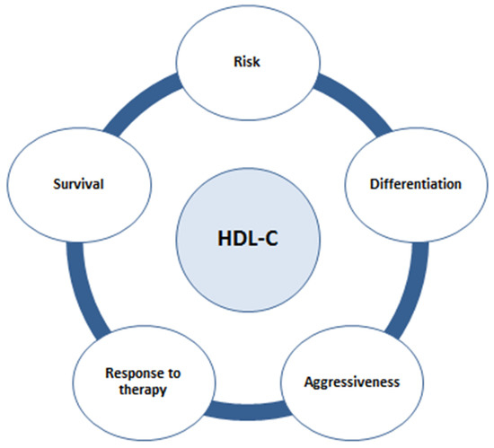 A reduced serum concentration of HDL-C was observed in patients with different types of cancers [15]. According to a meta-analysis of randomized controlled trials of lipid-altering interventions, every 10 mg/dL increase in the HDL-C level reduces the risk of cancer by 36% [16]. Although these data suggest that HDL particles might play a protective role against cancer development, the relationship between HDL-C levels, cancer incidence, and prognosis is not fully elucidated and seems to be influenced by the type of tumor [15]. In this regard, accumulating evidence suggests that a higher HDL-C level is associated with both a decreased risk of CRC development and increased survival (Figure 1). Of note, generalizability of the results of available studies is limited due to the small sample size and incomplete covariate information, since some of the studies were not specifically designed for lipid analyses. The European Prospective Investigation into Cancer and Nutrition (EPIC) study [17], which included cohorts from 23 centers in 10 European countries, found an inverse association between HDL-C and apolipoprotein AI (apoAI) levels with the risk of colon cancer. In addition, a meta-analysis by Yao et al. [18] confirmed that a higher HDL-C level is associated with a decreased risk of CRC.