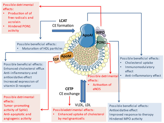 Nowadays, it is widely accepted that the role of HDL in both physiological and pathophysiological conditions goes far beyond its cholesterol content [48]. Therefore, the possible involvement of HDL in CRC development should be considered in light of its quality and functionality. The term HDL functionality refers to a plethora of known HDL-mediated effects on energy metabolism, the immune system, the inflammatory response, the redox balance, endothelial homeostasis, and various cellular functions [49]. Carriers of HDL functionality are structural components of this lipoprotein, i.e., proteins and complex lipids associated with HDL particles [50,51,52]. Due to the heterogeneity of HDL-conferred functions, it is difficult to develop a unique procedure for precise quantification of the overall functional capacity of HDL. Instead, a variety of assays are used for the assessment of particular HDL functions. The cholesterol efflux capacity is considered a crucial element of HDL functionality [53,54,55], and a range of assays employing radioisotope- or non-radioisotope-labeled cholesterol have been developed for estimation of this process efficacy [52]. In addition, activities of key RCT mediators, lecithin:cholesterol acyltransferase (LCAT) and cholesteryl ester transfer protein (CETP), can be used as indicators of RCT effectiveness [52]. The anti-inflammatory properties of HDL can also be assessed by several methods, which are generally based on co-incubation of different cell types with HDL and measurement of the cellular response to inflammatory stimuli [52,56]. It was proposed that the HDL inflammatory index (calculated as a ratio of the measured effects with and without the presence of HDL in cell culture) could be used as a metric for HDL’s anti-inflammatory properties [57]. Similarly, the anti-oxidative function of HDL can be assessed as a capability of HDL to protect LDL from oxidation [57] or to interfere with the production of reactive oxygen species [52]. Moreover, determination of the activities of HDL-associated enzymes involved in maintaining the redox balance, such as paraoxonase 1 (PON1) and myeloperoxidase (MPO), is also used as a measure of HDL’s anti-oxidative properties [58,59]. The effect of HDL on the expression of endothelial nitric oxide synthase (eNOS) can be assessed by measurement of NO production in the presence of HDL [52], while anti-apoptotic effects can be estimated by the quantification of nucleosomes [51]. Finally, analysis of the HDL proteome and lipidome offers novel possibilities for the quantification of HDL functionality that is reflected through the altered presence of specific lipid or protein constituents [60,61]. HDL contains more than 100 proteins with different functions, but apoAI, apolipoprotein M (apoM), and PON1 are most extensively investigated in terms of their possible role in malignant diseases. In addition, HDL functionality is strongly affected by changes in the activities of LCAT and CETP. Alterations in all these proteins should be considered with respect to colorectal carcinogenesis (Figure 2).