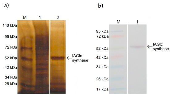 SDS-PAGE analysis of IAGlc synthase: M—molecular mass marker, 1—lysate, 2—purified IAGlc synthase fraction (a). Western blot analysis of IAGlc synthase: M—molecular mass marker, 1—purified IAGlc synthase fraction (b).