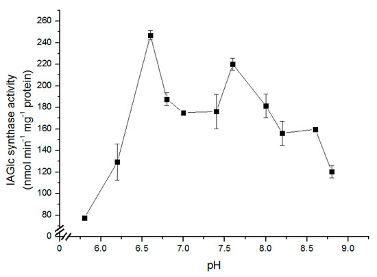 Effect of pH on the IAGlc synthase activity. Enzyme activity was determined using [14C]IAA after TLC (thin layer chromatography). For this assay, 25 mM HEPES buffers (pH 5.8; 6.2; 6.6; 6.8; 7.0; 7.4; 7.6; 8.0; 8.2; 8.6 and 8.8) were used. Catalytic activity was expressed as the means ± SD for three repetitions.