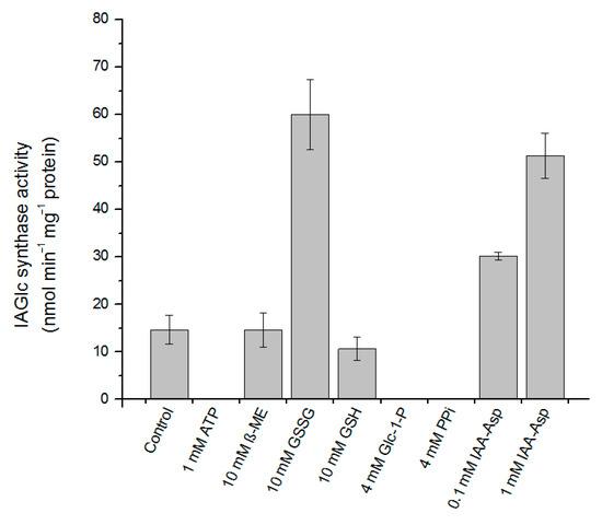 The activating effect on recombinant IAGlc synthase is also displayed by oxidized glutathione (GSSG) at 10 mM concentration, which activated the enzyme fourfold (Figure 5). Interestingly, reduced glutathione (GSH) at the same concentration is an inhibitor of the enzyme (relative activity of 72%). In the study on the native enzyme, GSH acted as an activator of the synthase [13].
