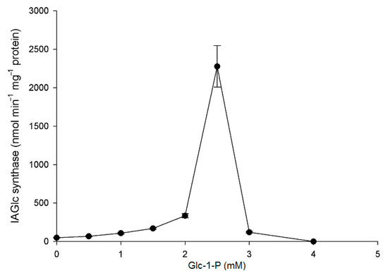 Effect of glucose-1-phosphate (Glc-1-P) on IAGlc synthase. The following concentrations of Glc-1-P were used for this assay: 0; 0.5; 1.0; 1.5; 2.0; 2.5; 3.0 and 4.0 mM. Enzyme activity was determined using [14C]IAA after TLC. Catalytic activity was expressed as the means ± SD for three repetitions.