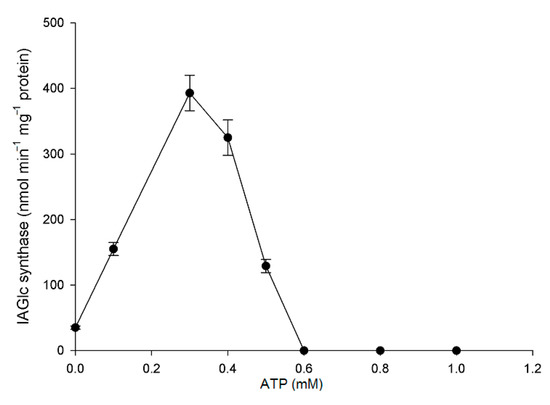 Effect of ATP on IAGlc synthase. The following concentrations of ATP were used for this assay: 0; 0.1; 0.3; 0.4; 0.5; 0.6; 0.8 and 1.0 mM. Enzyme activity was determined using [14C]IAA after TLC. Catalytic activity was expressed as the means ± SD for three repetitions.