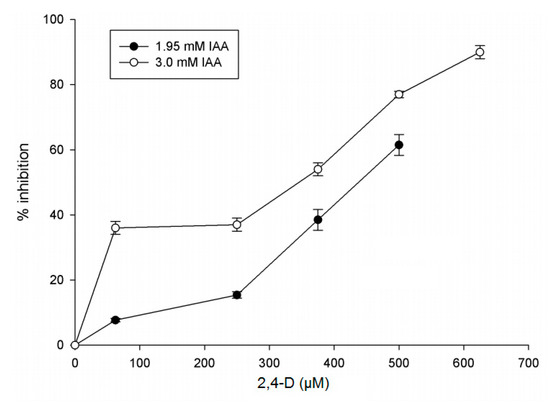 Effect of 2,4-D (2,4-dichlorophenoxyacetic acid) on IAGlc synthase. The assay was performed in the presence of 1.95 or 3.0 mM IAA. Inhibition (%) was expressed as the means ± SD for three repetitions. The following concentrations of 2,4-D were used for this assay: 0; 75; 250; 375; 500 and 675 μM. Enzyme activity was determined using [14C]IAA after TLC.