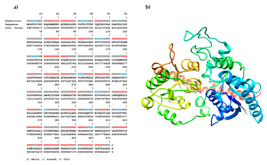 Three-dimensional structure of IAGlc synthase was modeled with the I-TASSER server (https://zhanglab.ccmb.med.umich.edu/I-TASSER/, accessed on 20 February 2021) [36,37,38,39]. The sequence-based prediction of the secondary structure using I-TASSER/PSSpred. The helix is marked in red, the strand is blue, and the coil is black (a). Predicted 3D model of IAGlc synthase in ribbon-style representation (b).