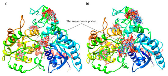 In silico molecular docking was performed with two different computational programs, SwissDock [40] and AutoDock Vina [41], to study the interaction of ATP and Glc-1-P with IAGlc synthase. We performed simple docking experiments in order to predict a possible binding site of ATP and Glc-1-P to IAGlc synthase, with the use of the SwissDock Server. Results indicated four different binding sites of these modulators to the protein (Figure 12). This may explain the different modulation (inhibition or activation) of the IAGlc synthase activity by these two compounds. One of the highest-ranked regions of ATP as well as Glc-1-P binding to IAGlc synthase is located in the sugar donor pocket. This pocket is the binding site of UDPG, therefore, we postulate that the modulator binding at this site decreases the activity of the synthase.