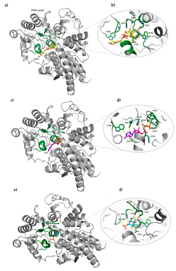 Docking analysis visualization of UDPG (a), ATP (c) and Glc-1-P (e) to IAGlc synthase performed with AutoDock. Hydrogen bonding interactions of UDPG (b), ATP (d) and Glc-1-P (f) with amino acid residues of the enzyme. Possible hydrogen bonds are marked with yellow dashed lines. The PSPG motif is presented in the ribbon-style representation in green.