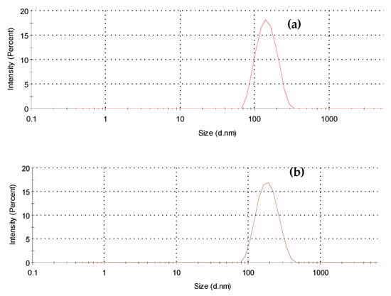 Particle size distribution for (a) blank (144.5 nm, PDI = 0.207) and (b) IgG loaded AZP nanospheres (185.5 nm, PDI = 0.190).