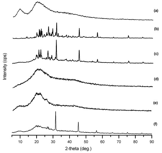 X-ray diffractograms of (a) zein, (b) AZP, (c) DHAB, (d) gelatin, (e) IgG and (f) IgG loaded AZP nanospheres.