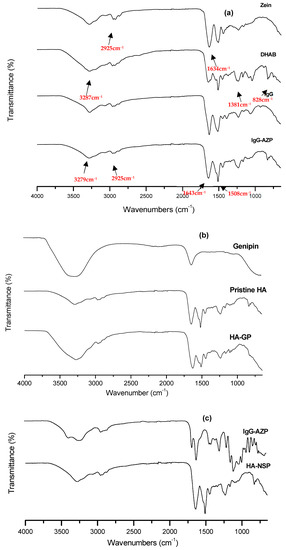 FTIR spectra of (a) Zein, DHAB, IgG and IgG loaded AZP nanospheres, (b) Genipin, Pristine HA and genipin crosslinked HA hydrogel and (c) IgG loaded AZP nanospheres and HA-NSP nanosystem.