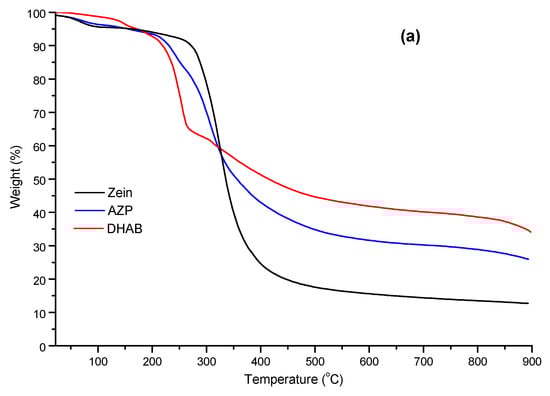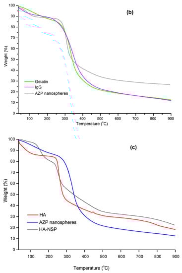 TGA thermograms of (a) zein, AZP and DHAB, (b) gelatin, IgG and IgG loaded AZP nanospheres and (c) HA, AZP nanospheres and HA-NSP.
