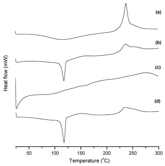 DSC thermograms of (a) Pristine HA, (b) HA gel, (c) NSP and (d) HA-NSP, measured from 25 °C to 300 °C.
