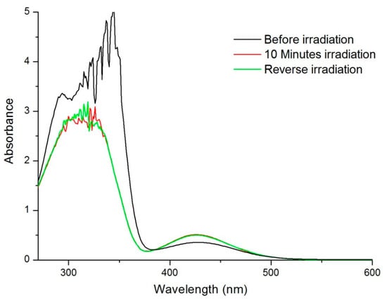 To investigate photo-response, UV-Vis spectra of AZP nanosphere aqueous dispersion were obtained before and after UV irradiation and are shown in Figure 8. To incite photo-isomerisation, samples were irradiated with UV light (365 nm) to induce conversion from trans to the cis structural isomer [34]. Prior to irradiation, a maximum absorption peak was seen at 345 nm and a flat and smaller peak at 430 nm. After UV irradiation, the peak at 345 nm decreased while a slight increase in intensity in the peak at 430 nm was observed. Irradiation of the solution with white light resulted in the recovery of the peaks observed before UV irradiation. This decrease in intensity can be described, according to Ding et al. (2016), as the decrease in molar extinction coefficient caused by the reduced concentration of the trans isomer in the solution, concurrently, the cis form increases, leading to an increased intensity at 430 nm. This is accounted for by the transformation of the azo group from trans to cis isomer upon UV irradiation and recovery (trans to cis) upon exposure to white light [27,35].