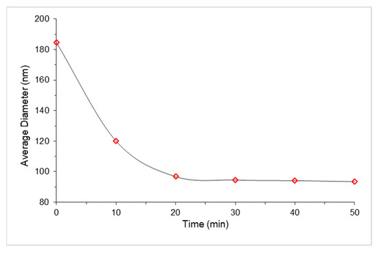 Furthermore, results from dynamic light scattering are presented in Figure 9 where the change in diameter as a function of irradiation is plotted against time. The same sample was used for all time points to avoid inconsistent results. A significant decrease in the diameter of the nanosphere in the first 20 min was observed from ~185 nm to ~97 nm, followed by a constant diameter of 94 nm. These results displayed a more compact sphere after UV irradiation and this is ascribed to the photo-isomerisation of the structure from trans to cis [36].