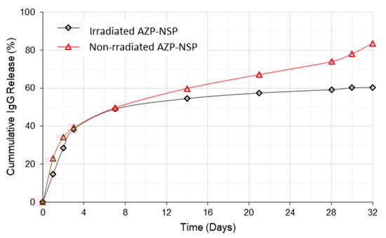 The drug loading capacity (IgG) of the nanospheres, calculated using Equations (1) and (2), was 83%. In Figure 10, in vitro release of IgG from non-irradiated and UV irradiated AZP nanospheres is shown. In the first 24 h, 25% of IgG was released from non-irradiated nanospheres and 15% from the UV irradiated nanospheres; this initial burst release of IgG is explained as the release of free drug that is not interacted with the polymer [26]. The rest of the drug was gradually released over 4 weeks up to 60% and 84% at day 32 from irradiated and non-irradiated nanospheres, respectively. The total drug released from the UV irradiated nanospheres at day 32 was 24% less than that of non-irradiated nanospheres (p ≤ 0.05); this may be due to the irradiation which results in a compact nanosphere and reduction of free volume, thus decreasing rate of diffusion and prolonging the release of IgG.