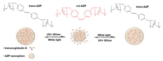 The proposed mechanism, previously described by Cai et al. (2014), of the reversible photo-induced IgG release, is illustrated in Figure 11, wherein, the AZP loaded nanosphere is subjected to UV light of wavelength 365 nm for a set amount of time and the trans-azo groups change into the cis form, resulting in reduced diameter of the nanosphere. The rate of diffusion decreases to allow slow release of IgG and in the reverse process where the nanospheres are irradiated with white light, azo groups reverse to trans form and the size of the sphere and rate of diffusion are increased [27,37].