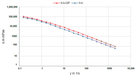 Shear viscosity measurements of the pure HA and HA-GP gels were performed to study the mechanical variation caused by the addition of genipin. In Figure 12, a slightly higher shear viscosity is observed in the HA-GP gel over the pure HA gel with a p-value 0.0006 substantiating the significant difference between these two hydrogels. These results confirm that adding genipin to pure HA increases viscosity of the gel. HA lacks the primary amino groups that genipin is known to react with; however, it is postulated that its highly reactive hydroxy groups are capable of forming glycosidic bonds with genipin which are stable in water [38,39].