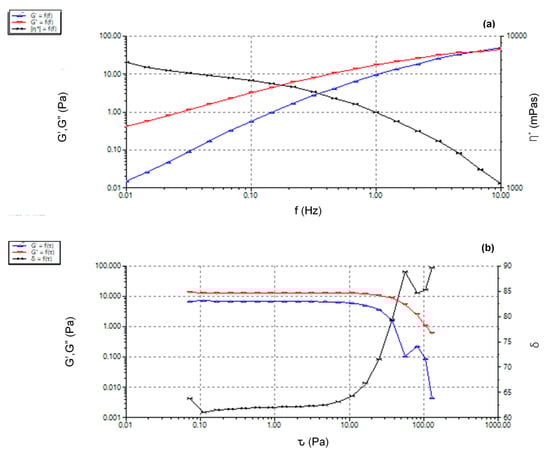 A frequency sweep from 0.1 Hz to 10 Hz at 1% strain, strain sweep of up to 100 Pa and yield stress tests were conducted at 25 °C as this is the temperature of the environment in which an injection would be performed. Viscoelastic behaviour was observed in Figure 13a, wherein the loss modulus was dominant below the crossover frequency 8 Hz (G’ = G” = 75 ± 0.5 Pa) and storage modulus was dominant above this frequency. Complex viscosity decreased with the increase in frequency, indicating shear thinning behaviour of the HA-NSP nanosystem [42]. The crossover point is the transition from viscous gel character where G” > G’ to elastic behaviour, G’ > G”. Material yielding was observed from the strain sweep in Figure 13b indicated by a drop in storage and loss moduli after 47.22 Pa strain. This yield strain is the point at which material starts to flow and this is essential for ease of injection of the formulation. Viscosity decreased with increasing shear stress confirming shear thinning behaviour of HA-NSP and further indicating homogenous dispersion of the nanospheres in the gel. Shear thinning gels experience a high shear rate exerted by the walls during injection, which results in a reasonable force of injection as a consequence of the decreased viscosity [43,44].