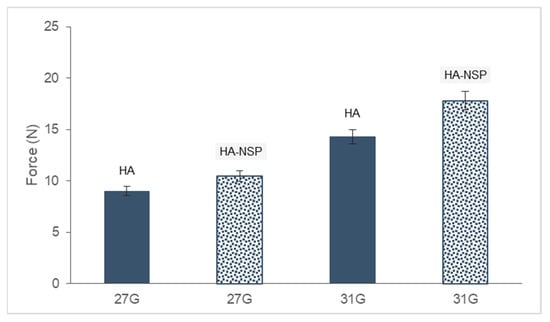 Injectability of the HA gel and HA-NSP was measured as the force required to inject the hydrogel through a 1 mL syringe fitted with 27 G and 31 G needles. HA-NSP is a composition of chromophore-equipped nanospheres dispersed in HA gel. The force required for injection works on 3 parts, (i) the resistance of the syringe plunger, (ii) the kinetic energy to the contents of the syringe and (iii) forcing the liquid through the needle [45]. This process is affected by the viscosity of the sample and the size of the needle used. The maximum force required to inject hydrogels was determined via texture analysis and results are shown in Figure 14. Injectability tests were conducted on HA and HA-NSP hydrogels through 27 G and 31 G needles. HA hydrogel required 9 N and 14 N, whereas the HA-NSP hydrogel required 10 N and 18 N to inject through 27 G and 31 G needles, respectively. Two parameters that affected the force of injection are the decrease in the size of the needle and the dispersion of nanospheres in the hydrogel which resulted in increased maximum force required for injection. These results remain within two thirds of the recommended value of the maximum force for a manual injection which is 30 N; therefore, the HA-NSP is suitable for injection through various routes of administration. Furthermore, for ease of administration and minimal discomfort, 10 N is the recommended maximum force and this qualifies the 27 G needle as the best suited selection for this formulation [46].