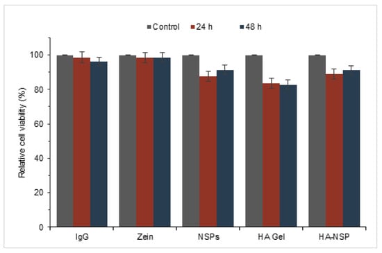 HRPE cells treated with injectable photo-responsive nanosystem (HA-NSP), NSPs, zein, HA gel and IgG solution were analysed using annexin v and dead cell assay. Results are presented Figure 15 as relative cell viability from the treated cultures of HRPE cells for up to a period of 48 h. The maximum concentrations of each component drug in the nanosystem were used as treatment. The relative viability of HRPE cells remained over 80% in all treated cultures. There was no significant change in viability from cells treated with both zein and IgG compared with untreated control cells, which confirmed the cytocompatibility of these components. Literature has attributed the cytocompatibility of zein to its degradation products that are beneficial to cell proliferation [47]. HA gel decreased cell viability by 20% over 48 h, whereas IgG loaded nanospheres and the HA-NSP decreased cell viability by 8% and 11%, respectively. Where relative cell viability is ≥70%, the material is considered non-cytotoxic [48]; therefore, these results show that the HA-NSP nanosystem is non-cytotoxic to HRPE cell lines.
