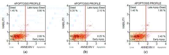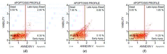 Apoptosis profiles for (a) untreated cells, (b) IgG, (c) zein, (d) NSP, (e) HA gel and (f) HA-NSP.