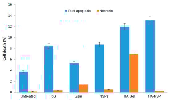 Annexin v binds to the externalised phosphatidylserine (PS) from asymmetrical cell membrane in apoptotic cells and the dead cell marker 7-AAD binds to necrotic cells [49]. Apoptosis eventually results in necrosis [50]. Late apoptosis is detected when the cell is positive for both PS and 7-AAD. Apoptosis profiles obtained from the study are displayed in Figure 16. Treated HRPE cell death after 48 h is presented as the percentage apoptosis and necrosis (Figure 17). These results show that the dominant pathway for cell death was apoptosis for all treatments. HA gel showed the highest percentage of necrotic cells (7%) and this may be attributed to the presence of genipin [24]; however, this percentage was 0.25% for HA-NSP confirming that cytocompatibility was improved in the composition of HA gel and AZP nanospheres.